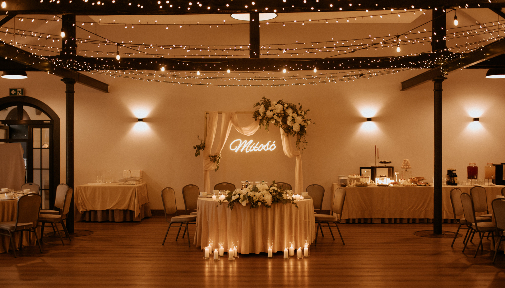 Wyjątkowy design sal weselnej, połączony z subtelną grą świateł, tworzy elegancką i inspirującą atmosferę, idealną na niezapomniane wydarzenia. To jedno z najciekawszych miejsc na wesele pod Poznaniem w Wielkopolsce!